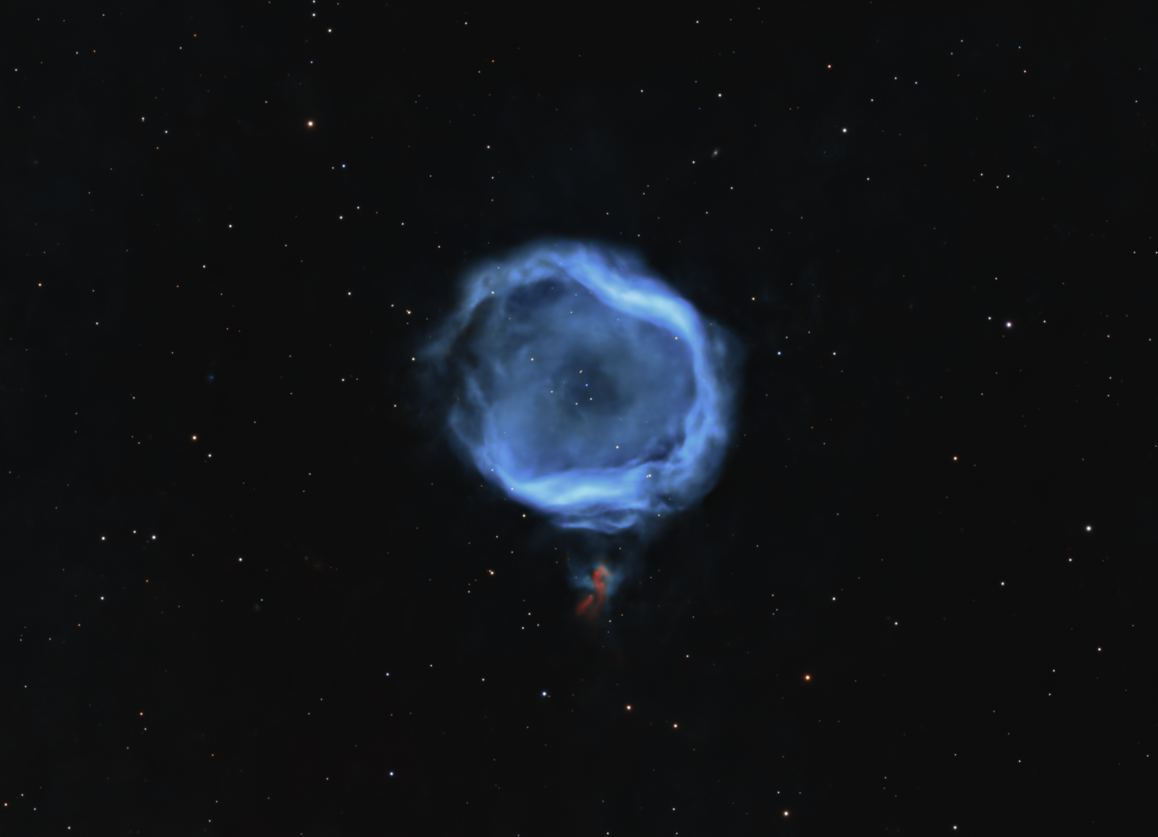 According to Brian: "Not to be confused with Jones-Emberson 1, this is a pretty faint planetary nebula. I’m not thrilled with the sky brightness. I need to rework this one at some point — maybe tomorrow, but for now this is what I’ve come up with. It’s a combination of Ha and OIII, but the OIII is really dominant here. Ha only really appears in a wispy filament below the PN."