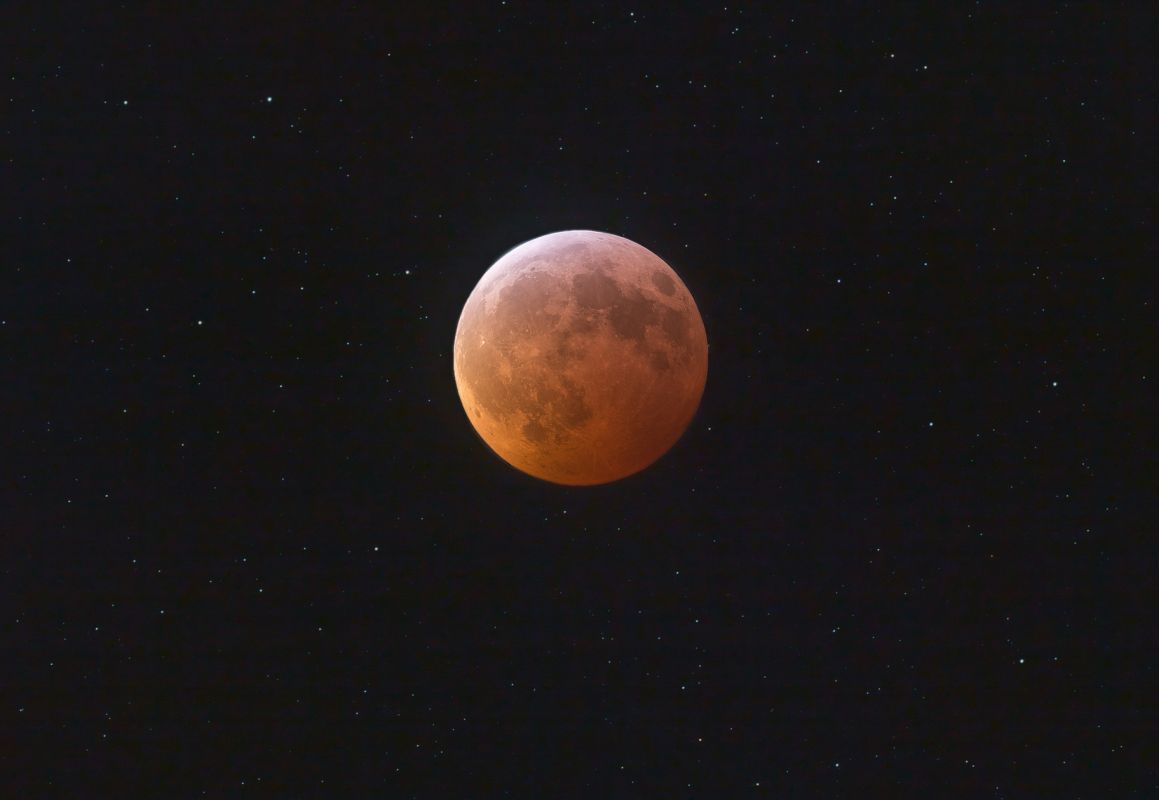 "A cold and very windy night. I was observing the eclipse through binoculars, and it was very beautiful. In processing, I tried to mimic the color and intensity of the eclipsed moon vs. the background stars that I was seeing through the binoculars the other night. The stars and moon were processed separately and then recombined, but from the same forty 1-sec. frames." Image copyright Nico Carver
